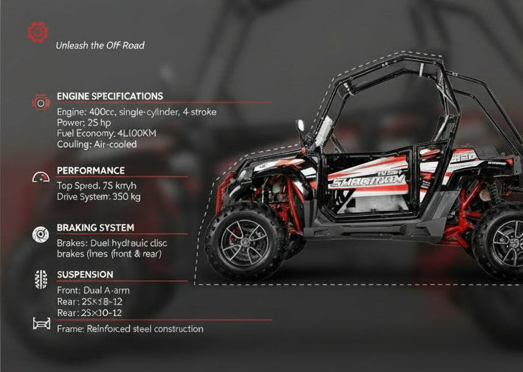 Built for adventure in the UAE, the Predator 420 is a rugged and reliable 2-seater UTV perfect for desert outings, camping trips, and weekend fun. Its powerful 400cc, 4-stroke engine delivers 25 hp and speeds up to 75 km/h, giving you strong performance across dunes and off-road trails. Dual hydraulic disc brakes on both axles provide confident stopping power, while the reinforced steel frame ensures long-lasting durability in tough UAE conditions.