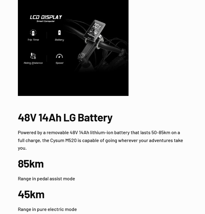 *Powered by a removable 48V 14Ah lithium-ion battery that lasts 50-85km on a full charge, the Cysum M520 is capable of going wherever your adventures take you.