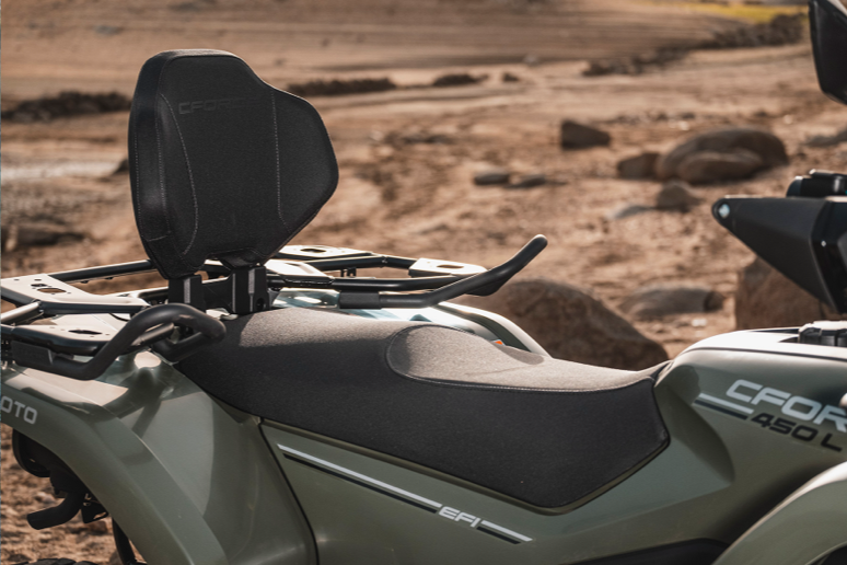 Built to accommodate two riders comfortably, the CFORCE 450L features improved ergonomics – a higher handlebar, lower foot brake, and a narrower fuel tank for better legroom. The 17-liter tank capacity extends your operational range, while optimized seat cushioning helps to combat rider fatigue over long work days or extended trail rides.
