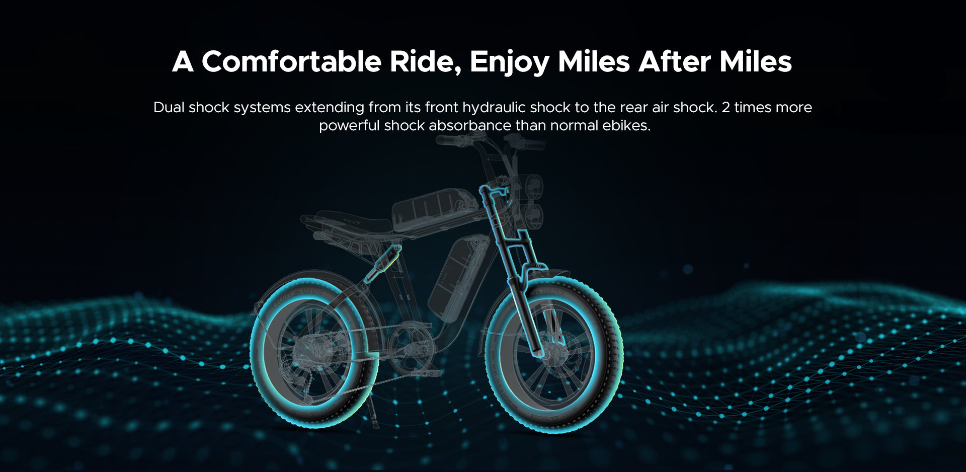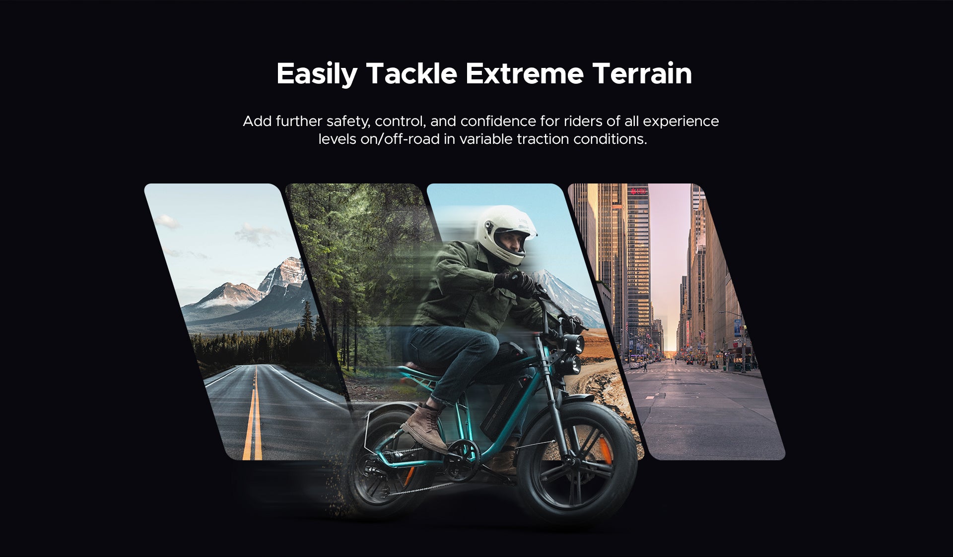 The 20 x 4.0-inch fat tires are equipped with a three-layer design made up of imported rubber, carbon nano braiding, and a butyl rubber inner tube that enables you to travel comfortably on any terrain.