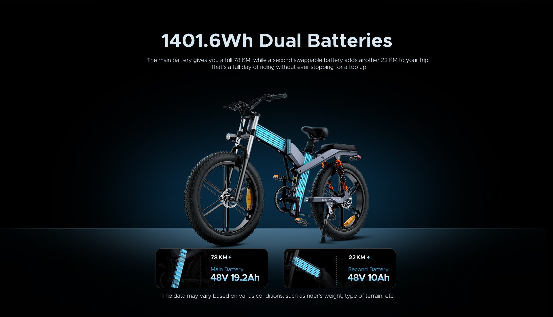 Comes With Dual battery 48V19.2Ah Lithium-Ion Battery (main) + 48V10Ah Lithium-Ion Battery *1 (additional)