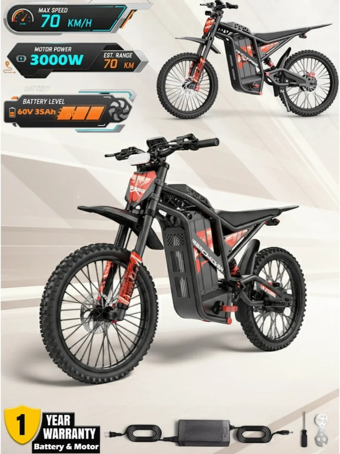 Windhorse Y1, the ultimate mid-range electric dirt bike built for UAE speed and adventure seekers. Powered by a 3000W motor and a 60V 35Ah Removable battery, it reaches up to 70KM/H with a 70KM range. The carbon alloy frame, hydraulic brakes, and advanced suspension deliver unbeatable control and comfort on any terrain.