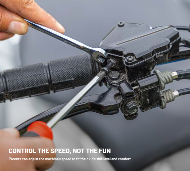 Safety flag, parent-adjustable speed limiter, free online safety training, safety tether, The speed of this vehicle is restricted to under 15 mph (24 km/h) at manufacture. The speed limiting device may be adjusted by supervising adults when they determine that their child is capable of handling additional speed. The unrestricted top speed for this model is 30 mph (48 km/h).