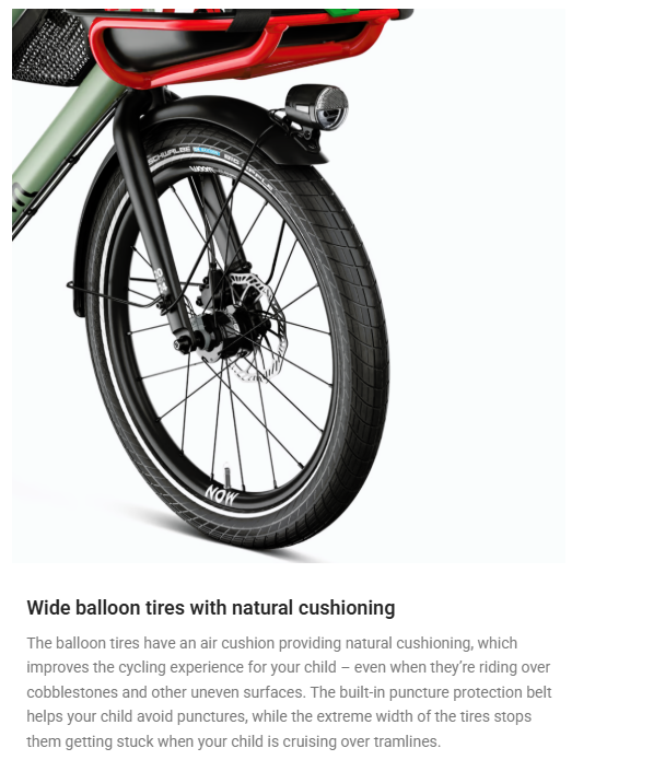 The balloon tires have an air cushion providing natural cushioning, which improves the cycling experience for your child – even when they're riding over cobblestones and other uneven surfaces. The built-in puncture protection belt helps your child avoid punctures, while the extreme width of the tires stops them getting stuck when your child is cruising over tramlines.