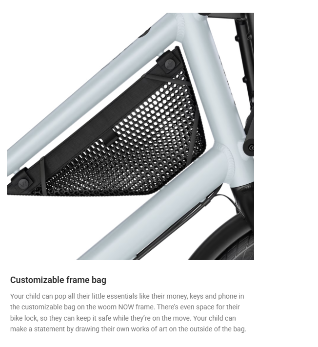 Your child can pop all their little essentials like their money, keys and phone in the customizable bag on the woom NOW frame. There's even space for their bike lock, so they can keep it safe while they're on the move. Your child can make a statement by drawing their own works of art on the outside of the bag.